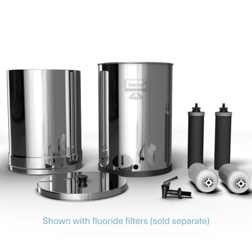 Our largest filtration model, the Crown Berkey holds six gallons of filtered water, and can accommodate 2 - 8 Black Berkey Filters and Fluoride Filters. As with other systems, adding additional Black Filters, will speed up the filter time, getting you filtered water faster!